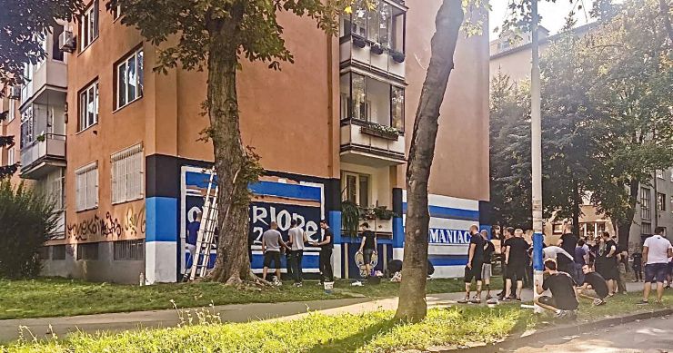 Grupa navijača fudbalskog kluba Željezničar okupila se danas na Grbavici i iscrtala grafit na jednoj od zgrada.