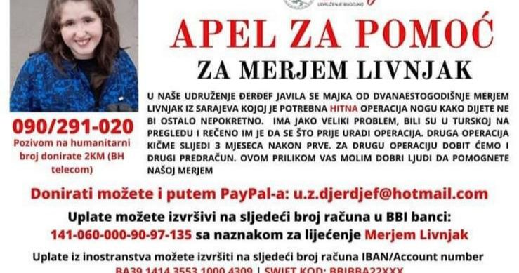 Merjem Livnjak (12) iz Sarajeva neophodna je pomoć dobrih ljudi. Ovoj djevojčici je potrebna operacija nogu kako ne bi ostala nepokretna.