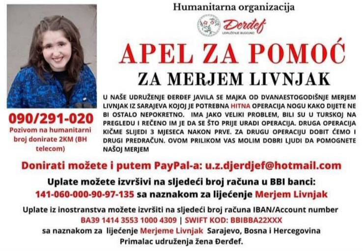Uplate možete izvršiti na sljedeći broj računa u BBI banci: 141-060-000-9-97-135 sa naznakom za liječenje Merjem Livnjak.