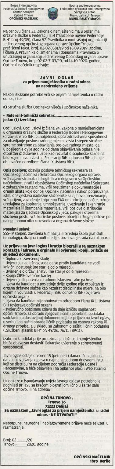 “Ovako izgleda konkurs u Općini Trnovo par dana pred izbore. Jedan od uslova jeste Srednja grafička škola. Zamolio bih sve osobe koje ispunjavaju uslove da se prijave na ovaj konkurs, da vidimo da li je konkurs namijenjen bivšoj predsjedavajućoj. Koliko smo jaka općina i koliko smo napredovali da nam trebaju dva tehnička sekretara. Nadam se reviziji diploma u Općini Trnovo ša da se vidi koliko ne/stručnih ljudi radi na poslovima za koje nisu kvalifikovani”, poručio je Tatarević.