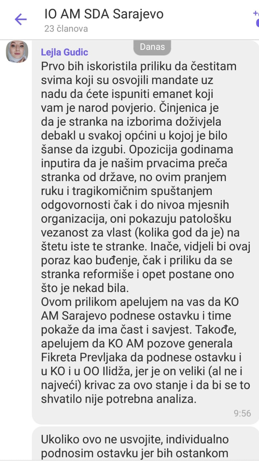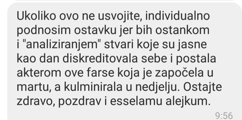 “Ovim putem zbog cjelokupne situacije i iz moralnih razloga tražim ostavku predsjednika AM SDA Sarajevo kao i uvođenje povjereništva u OO AM Ilidža, Novo Sarajevo, Centar, Stari Grad i sve su prilike Ilijaš. Također predlažem zaključak kojim mi kao KO AM SDA Sarajevo tražimo ostavku KO SDA Sarajevo na čelu sa Fikretom Prevljakom, jer ti ljudi više neaju nikakav legitimitet”, napisao je Eman Vukotić predsjednik Asocijacije mladih Ilidža.