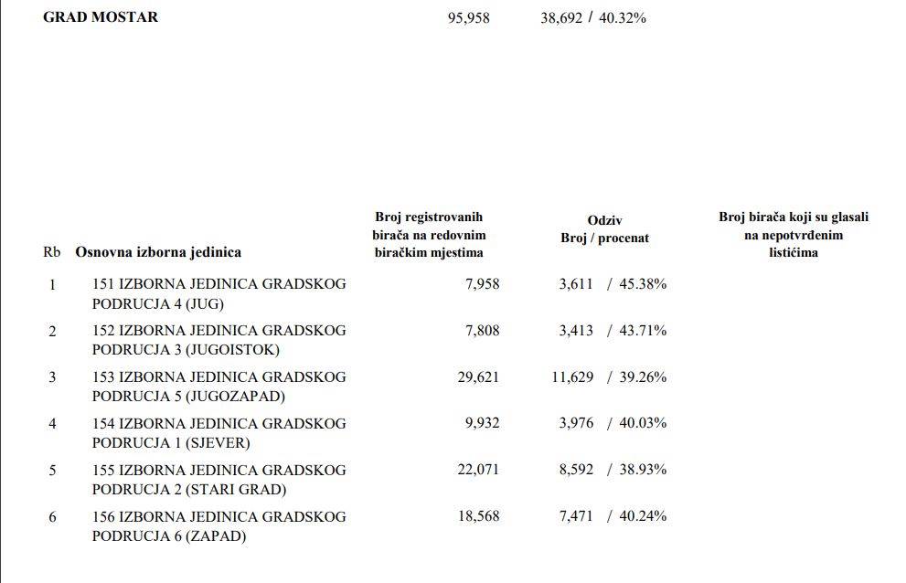 Od ukupnog broja registrovanih birača na redovnim biračkim mjestima (95.958) na izbore je izašlo 38.692 građana grada na Neretvi.
