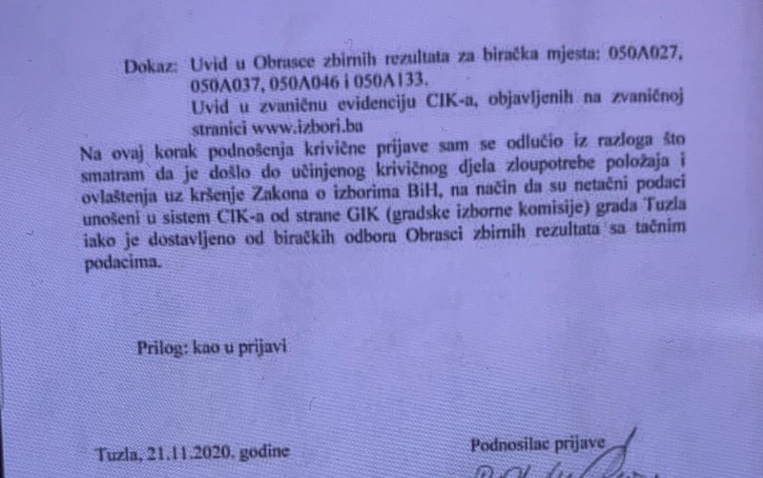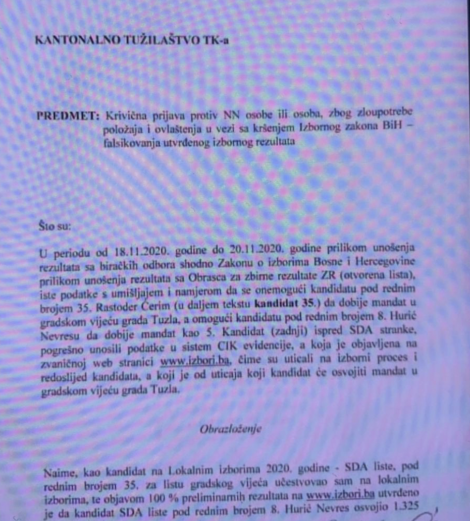 Kandidat SDA za Gradsko vijeće Grada Tuzla Ćerim Rastoder podnio je krivičnu prijavu Kantonalnom tužilaštvu Tuzlanskog kantona zbog izbornih nepravilnosti.