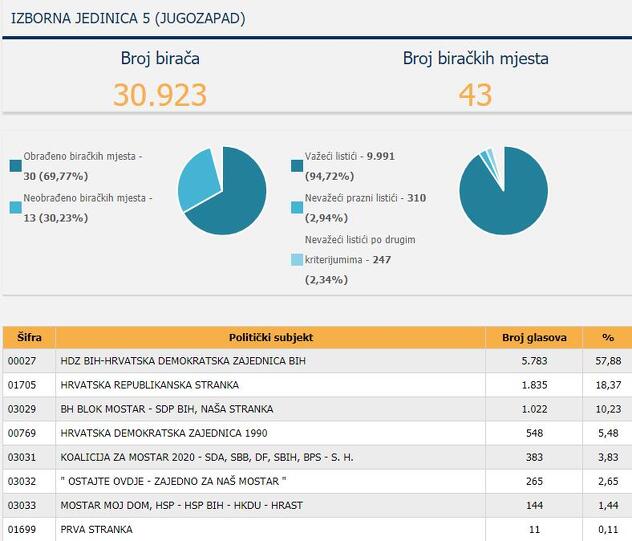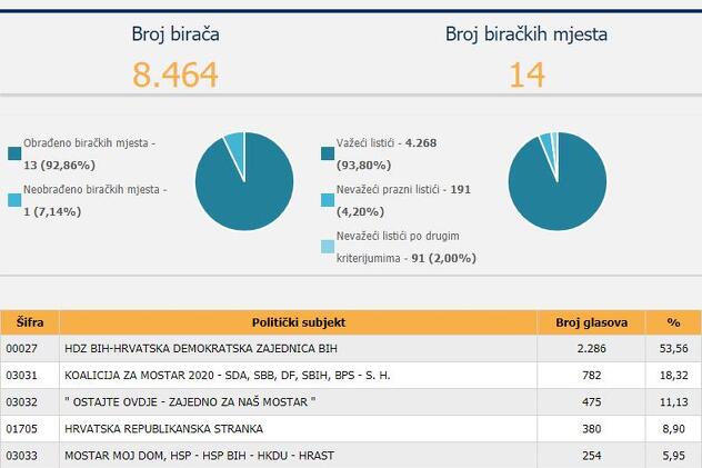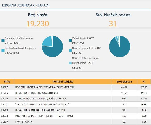 U ovoj izbornoj jedinici HDZ je osvojio 2.286 glasova na osnovu 92% obrađenih listića, Koalicija za Mostar 782, a Srpska lista 475.