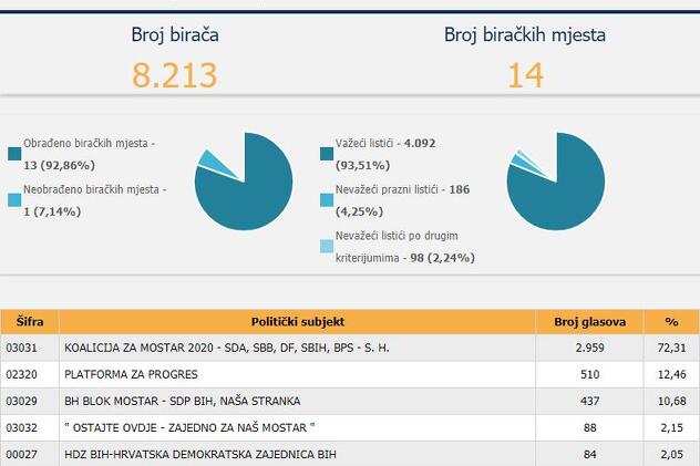 U ovoj izbornoj jedinici Koalicija za Mostar je također osvojila najviše glasova i to 2.959 na osnovu 92% obrađenih glasova, slijedi Platforma za progres sa 510 te Bh. blok sa 437.