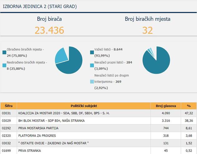 U Starom Gradu na osnovu 75% obrađenih listića Koalicija za Mostar je osvojila 4.090 glasova, Bh. blok 3.316, Prva Mostarska Partija 744, Platforma za progres 318.