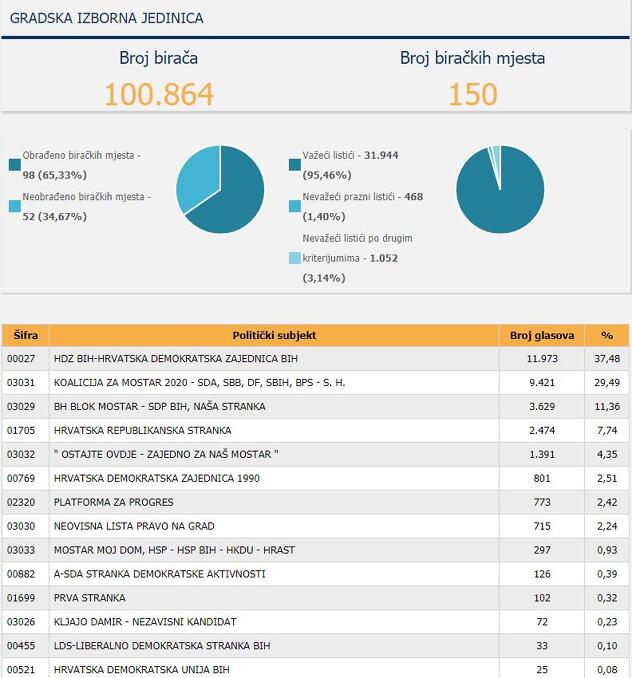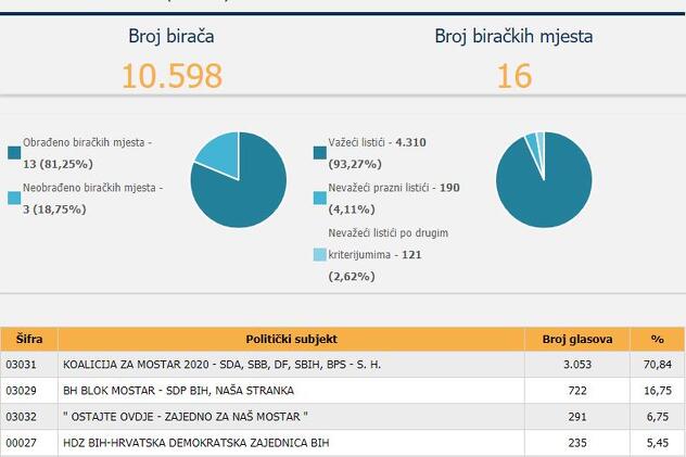 Centralna izborn akomisija Bosne i Hercegovine (CIK) saopćila je nove rezultate izbora u Mostaru i to nakon više od 65 posto obrađenih glasova na Centralnoj Gradskoj listi te s još većim procentom obrađenih glasova na sedam gradskih područja.