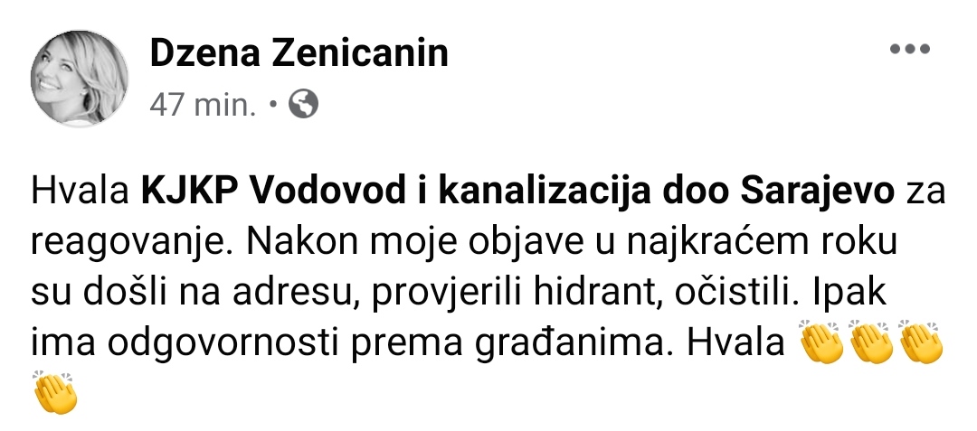 Iz KJKP “ViK”-a d.o.o. Sarajevo stigla je brza reakcija te se ekipa zaputila na adresu. Naime, provjerili su o čemu se radi i riješili navedeni problem.