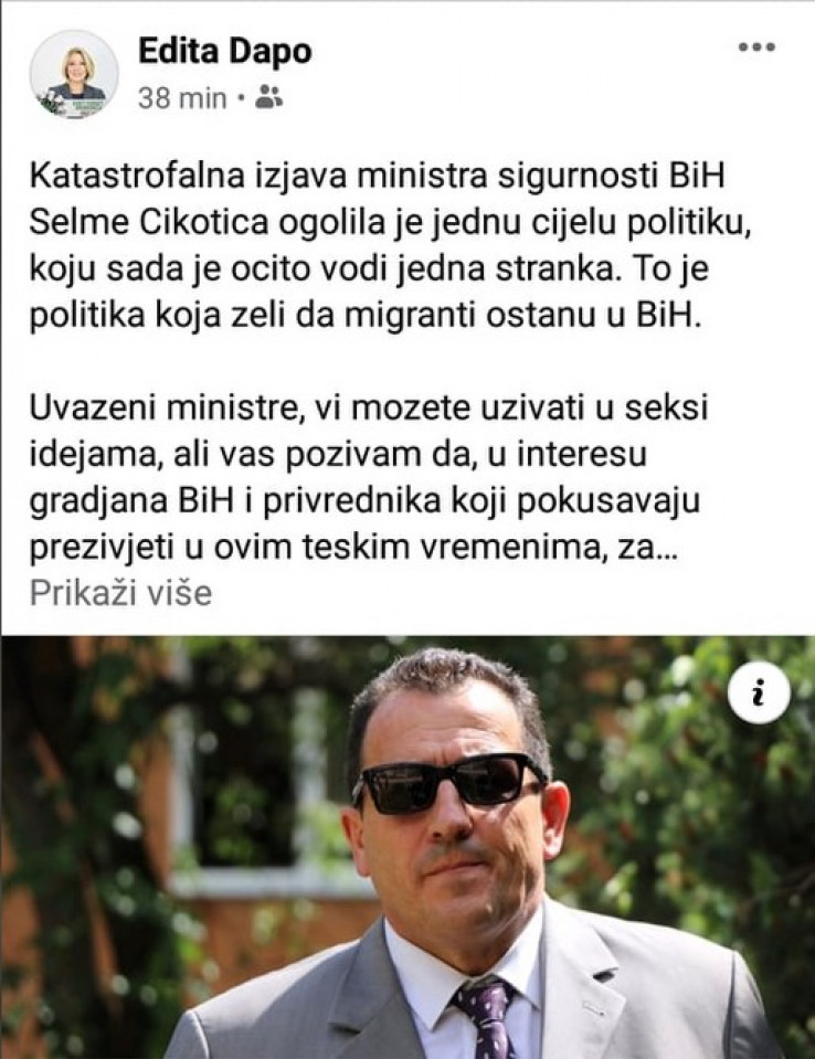 “Katastrofalna izjava ministra sigurnosti BiH Selme Cikotića ogolila je jednu cijelu politiku, koju sada je očito vodi jedna stranka. To je politika koja želi da migranti ostanu u BiH.
