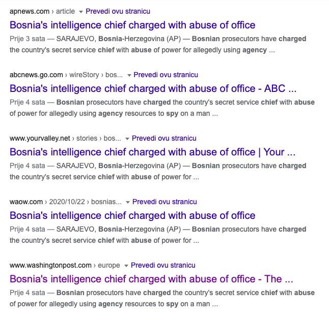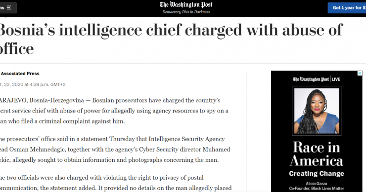 “Tužilaštvo BiH u četvrtak je saopćilo kako je čelnik Obavještajno-sigurnosne agencije Osman Mehmedagić, zajedno s direktorom Odjela za cyber sigurnost te agencije Muhamedom Pekićem, navodno tražio informacije i fotografije u vezi s tom osobom”, pišu svjetski mediji.