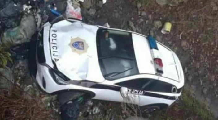Na policijskom automobilu, koji je završio na strmini pored puta, je pričinjena velika materijalna šteta, ali su policajci nasreću prošli bez težih posljedica.