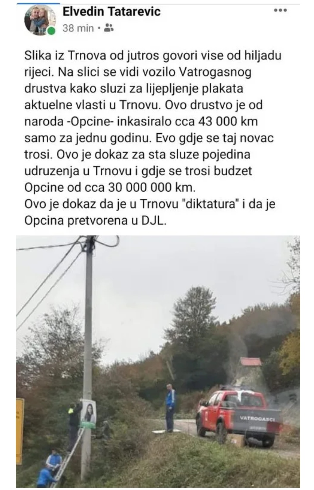 „Slika iz Trnova od jutros govori više nego hiljadu riječi. Na slici se vidi vozilo Vatrogasnog društva kako služi za lijepljenje plakata aktuelne vlasti u Trnovu. Ovo društvo je od naroda, Općine, inkasiralo oko 43.000 KM za jednu godinu. Evo gdje se taj novac troši. Ovo je dokaz za šta služe pojedina udruženja u Trnovu i gdje se troši budžet Općine od oko 30.000.000 KM. Ovo je dokaz da je u Trnovu diktatura i da je općina pretvorena u DJL“, napisao je Tatarević.