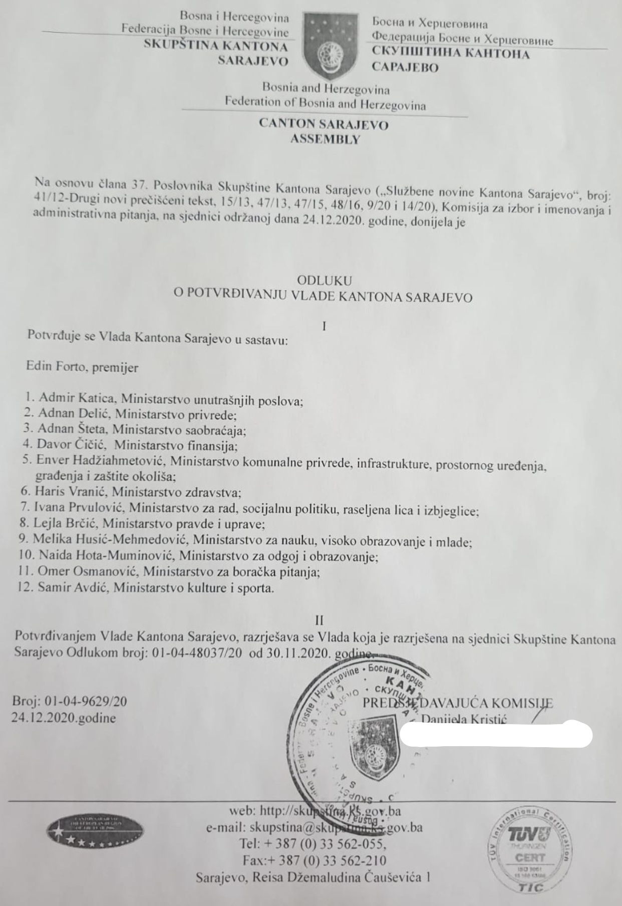 Komisija za izbor i imenovanja i administrativna pitanja održala je danas sjednicu na kojoj je donijela Odluku o potvrđivanju Vlade Kantona Sarajevo.