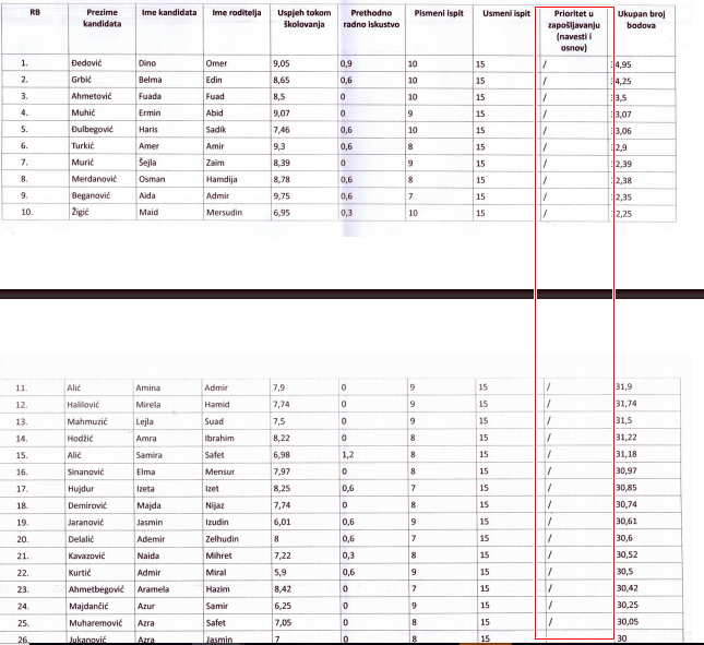 S tim u vezi, niti jedan od 100 prijavljenih kandidata nema nikakvih prioritetnih bodova. Tako npr. djeca poginulih boraca i ratnih vojnih invalida nisu imala bodove prioriteta, koji su mogli popraviti njihov ukupni plasman na konkursu. Zbog čega se ovog puta niko od 100 prijavljenih kandidata nije bodovao po prioritetu?