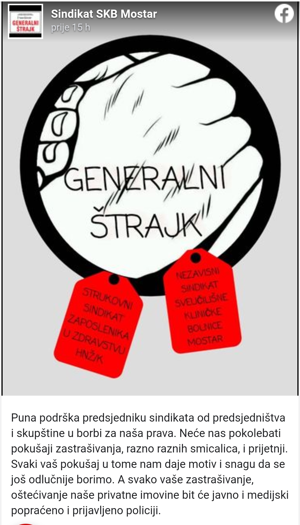 Sindikati su i putem Facebook izrazili punu podršku predsjedniku: