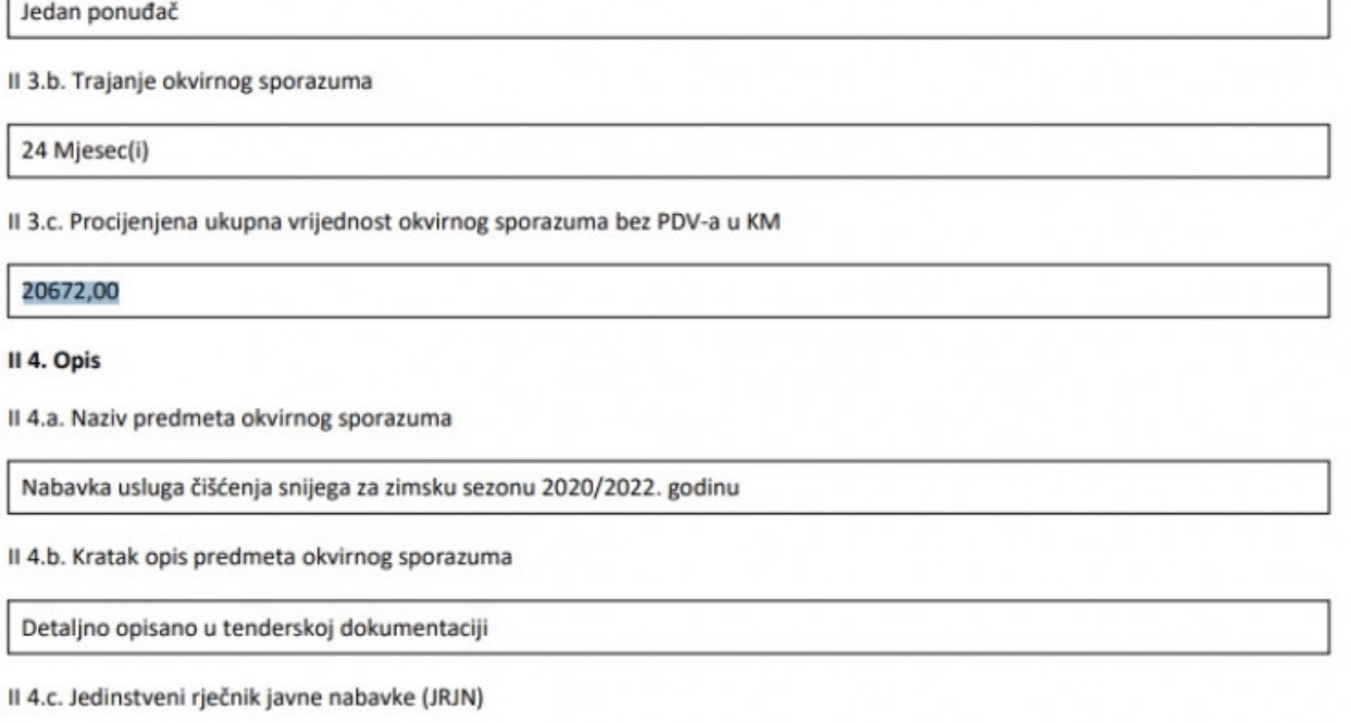 Procijenjena ukupna vrijednost okvirnog sporazuma bez PDV-a iznosi 20.672,00 maraka.