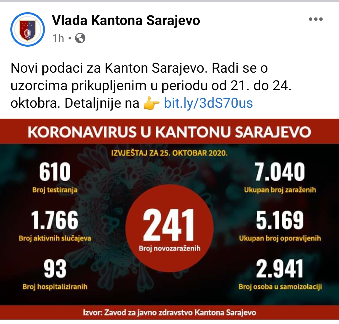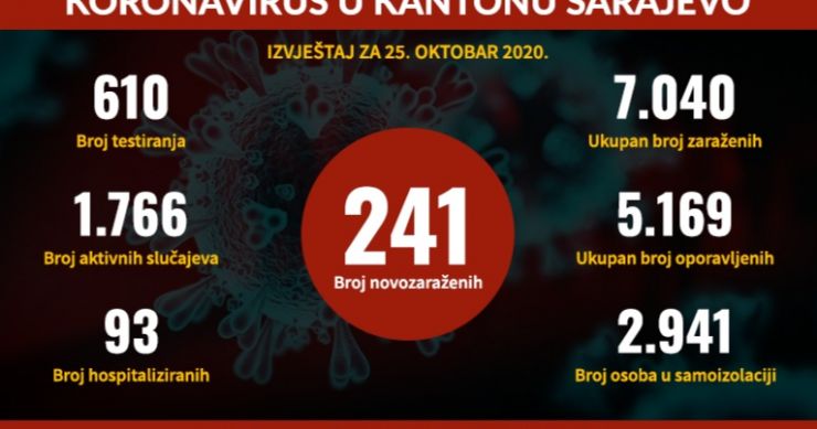 Vlada Kantona Sarajevo danas je objavila da je prema podacima Zavoda za javno zdravstvo KS, u protekla 24 sata potvrđen je 241 novi slučaj zaraze koronavirusom u Kantonu Sarajevo. Ovaj broj je rezultat analize provedene u protekla 24 sata nad 610 uzoraka prikupljenih u periodu od 21. do 24. oktobra ove godine. U infografici navode se podaci za 25. oktobar, te se tako i evidentiraju.