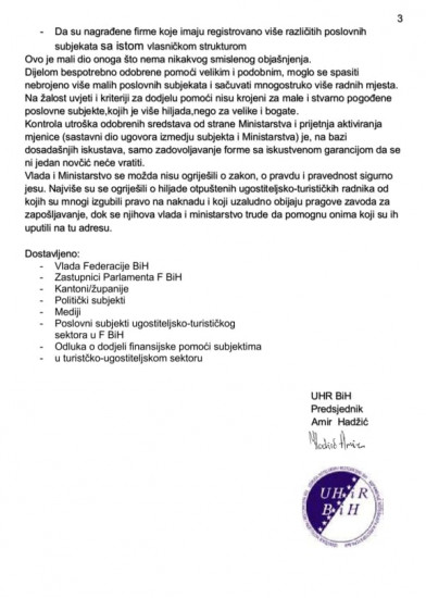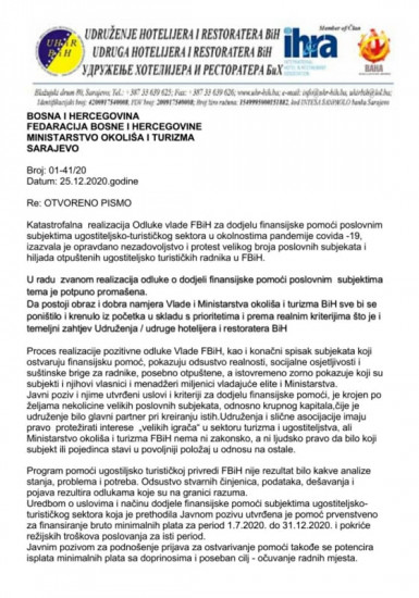 Katastrofalna realizacija Odluke Vlade FBiH za dodjelu finansijske pomoći poslovnim subjektima ugostiteljsko-turističkog sektora u okolnostima pandemije Covida -19, izazvala je nezadovoljstvo i protest velikog broja poslovnih subjekata i hiljada otpuštenih ugostiteljsko turističkih radnika u FBiH.