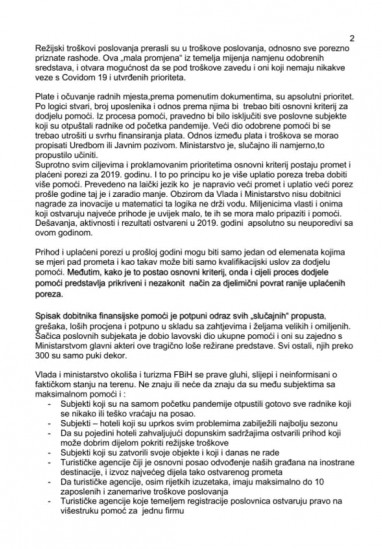 Dodaju da su plaće i očuvanje radnih mjesta apsolutni prioritet. Po logici stvari, broj uposlenika i odnos prema njima bi trebao biti osnovni kriterij za dodjelu pomoći. Iz procesa pomoći, pravedno bi bilo isključiti sve poslovne subjekte koji su otpuštali radnike od početka pandemije. Veći dio odobrene pomoći bi se trebao utrošiti u svrhu finansiranja plata. Odnos između plata i troškova se morao propisati Uredbom ili Javnim pozivom. Ministarstvo je, slučajno ili namjerno,to propustilo učiniti.