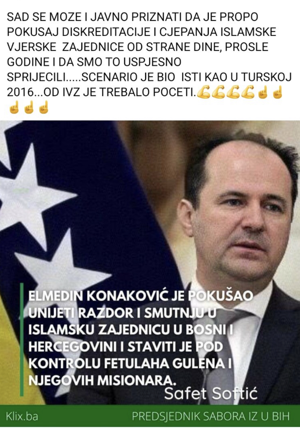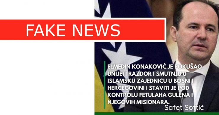 Jedna od lažnih vijesti tj. dezinformacija koje se dijeli među botova stranaka je i navodna izjava predsjednika Sabora Islamske zajednice u Bosni i Hercegovini Safeta Softića da je predsjednik Naroda i pravde (NiP) “Elmedin Konaković pokušao unijeti razdor i smutnju u Islamsku zajednicu i staviti je po kontrolu Fetulaha Gulena”.