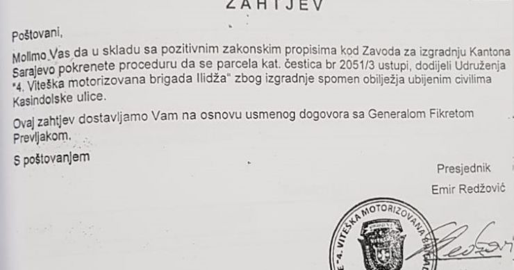 Predsjednik Udruženja “4. viteška motorizovana brigada Ilidža” Emir Redžović dostavio je ministru za boračka pitanja KS Hajrudinu Grabovici zahtjev kojim traži da se kod Zavoda za izgradnju KS pokrene procedura za dodjelu parcele ovom udruženju zbog izgradnje spomen obilježja ubijenim civilima Kasindolske ulice.