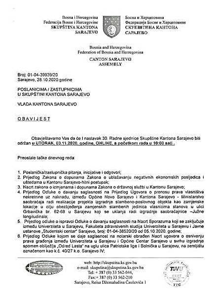 Online sjednica sa identičnim dnevnim redom kakav se pred zastupnicima trebao danas naći održat će se 3. novembra 2020. godine.