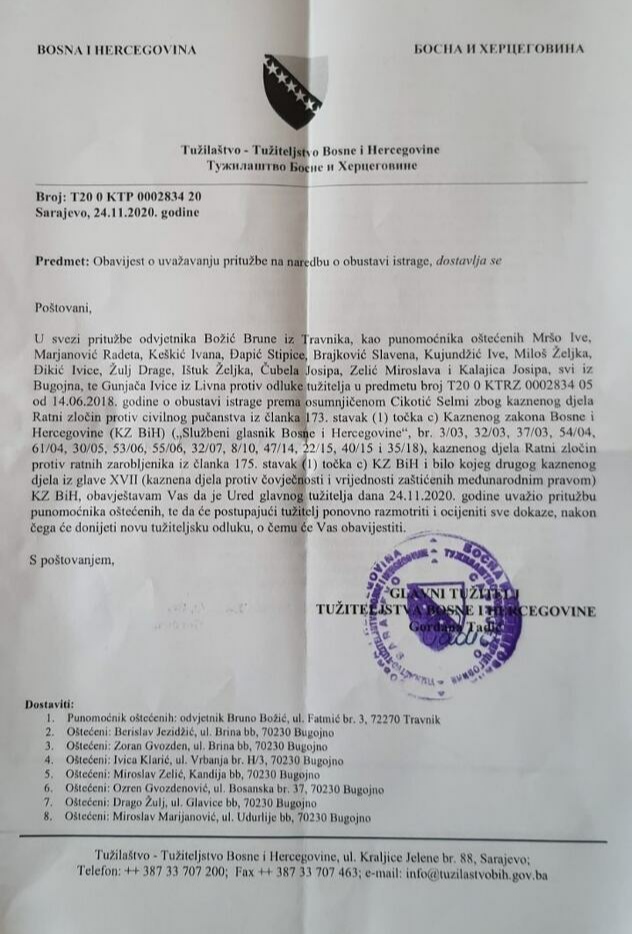 Tužilaštvo navodi kako je uvažilo žalbu advokata koji zastupa 13 Hrvata iz Bugojna te jednog iz Livna protiv odluke tužitelja o obustavi istrage prema Selmi Cikotiću zbog krivičnog dijela ratni zločin protiv civilnog stanovništva.