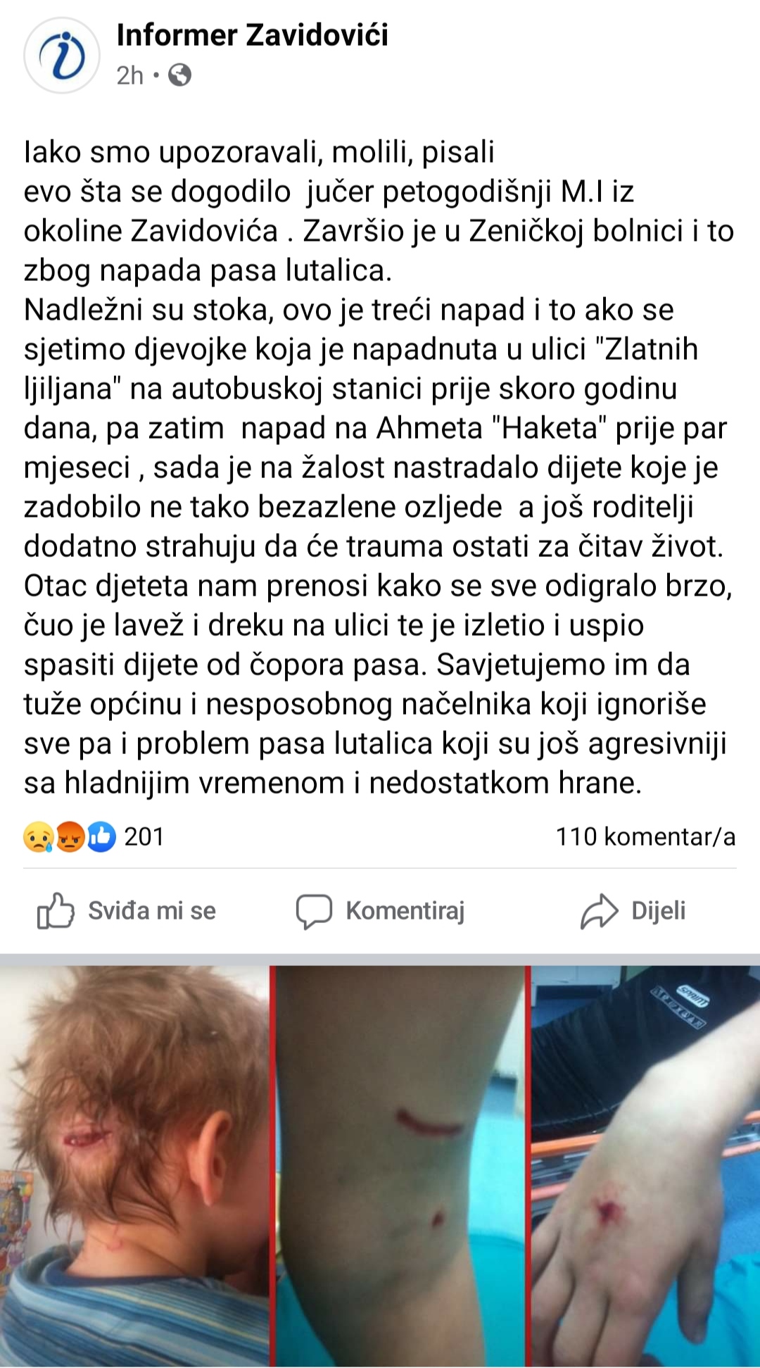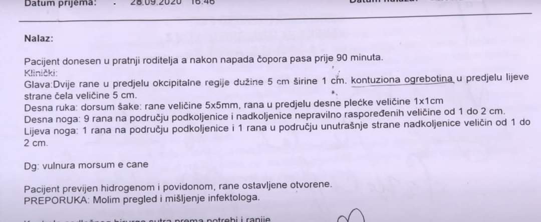 Naime, otac petogodišnjeg M.I. kaže da se sve odigralo brzo. Čuo je lavež i dreku na ulici potom je izletio i uspio spasiti dijete od čopora pasa. Dijete je prevezeno u bolnicu u Zenici gdje mu je pružena sva adekvatna pomoć ljekara.