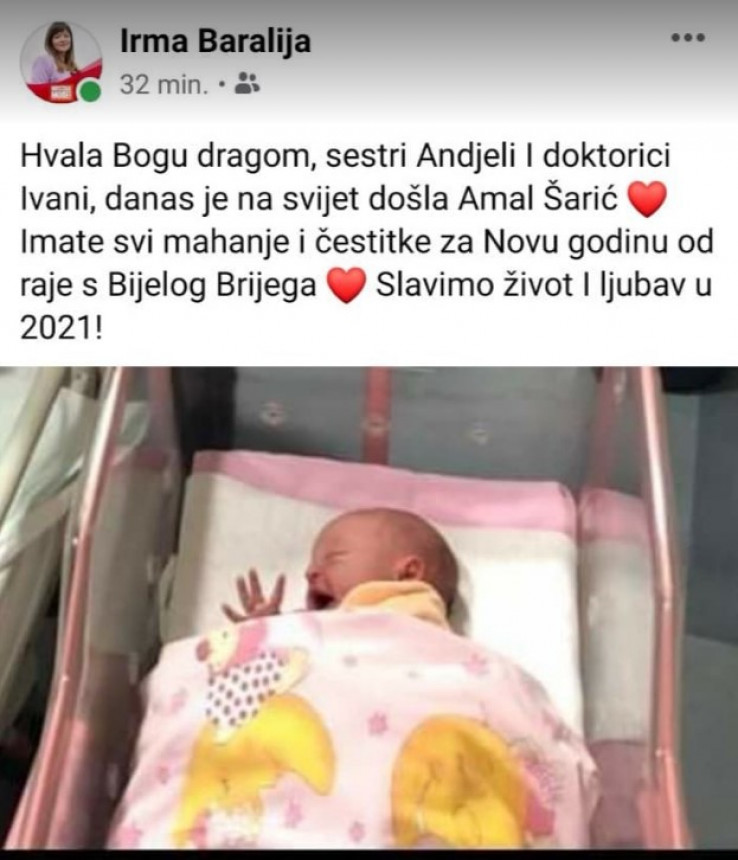 Hvala Bogu dragom, sestri Anđeli i doktorici Ivani, danas je na svijet došla Amal Šarić. Imate svi mahanje i čestitke za Novu godinu od raje s Bijelog Brijega. Slavimo život i ljubav i 2021. – napisala je Barajlija na Facebooku.