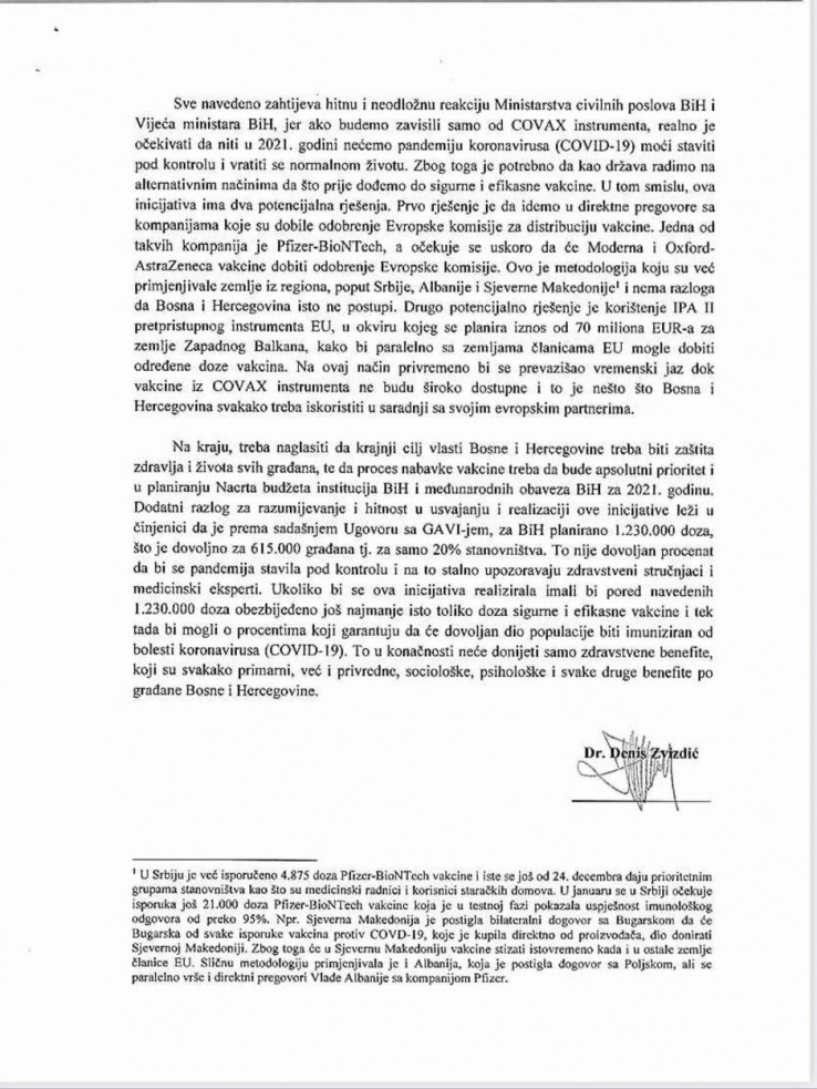 Zvizdić navodi da nema razloga za to da se ne ide u direktni sporazum s obzirom na to da su na isti način Pfizerove vakcine nabavile zemlje iz regije poput Srbije, Albanije i Sjeverne Makedonije. Istovremeno je potrebno i u što kraćem roku aktivirati paket Evropske unije od 70 miliona eura za rani pristup vakcinama protiv koronavirusa, a koji je odobren za zemlje Zapadnog Balkana.