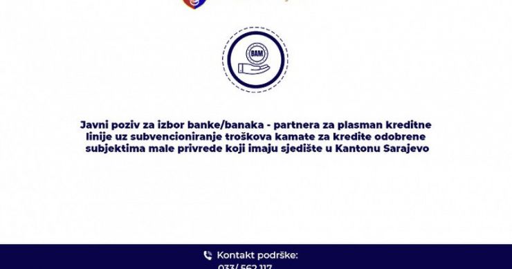 Prvi objavljeni poziv je za izbor banaka-partnera u provođenju programa “Obezbjeđenje kreditiranja pod povoljnijim uslovima”. Ovim Javnim pozivom vrši se izbor do tri banke za realizaciju kreditne linije uz stopostotnu subvencioniranu kamatnu stopu, a ukupan iznos kreditnih sredstava koji se planira realizirati kroz ovu kreditnu liniju je najmanje 90 miliona KM.