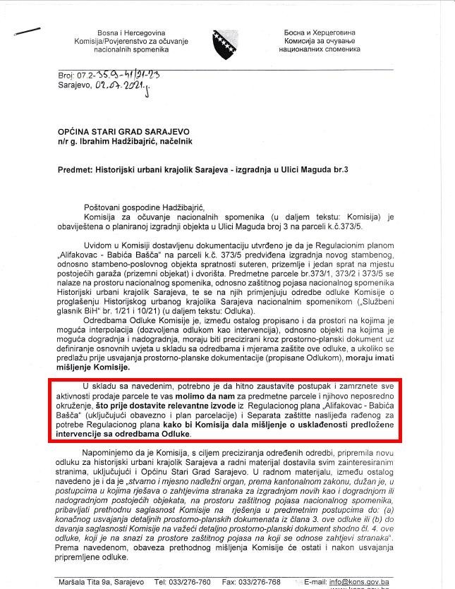 Komisija za očuvanje nacionalnih spomenika Bosne i Hercegovine uputila je danas zvanični akt Općini Stari Grad u kojem se ističe da Komisija traži hitno zaustavljanje postupka i zamrzavanje svih aktivnosti prodaje parcele, za koju je Općina Stari Grad 14.06.2021. raspisala javni konkurs za prodaju, oglašavajući je kao građevinsko zemljište, po kulturi gradilište, te da Općina Stari Grad treba što prije dostaviti relevantnu dokumentaciju, kako bi Komisija dala mišljenje o usklađenosti predložene intervencije u prostoru sa odrerdbama odluke Komisije o proglašenju Historijskog urbanog krajolika Sarajeva nacionalnim spomenikom.