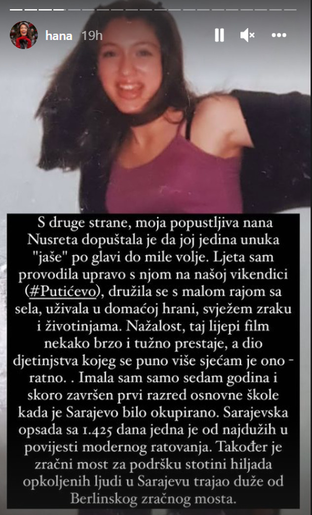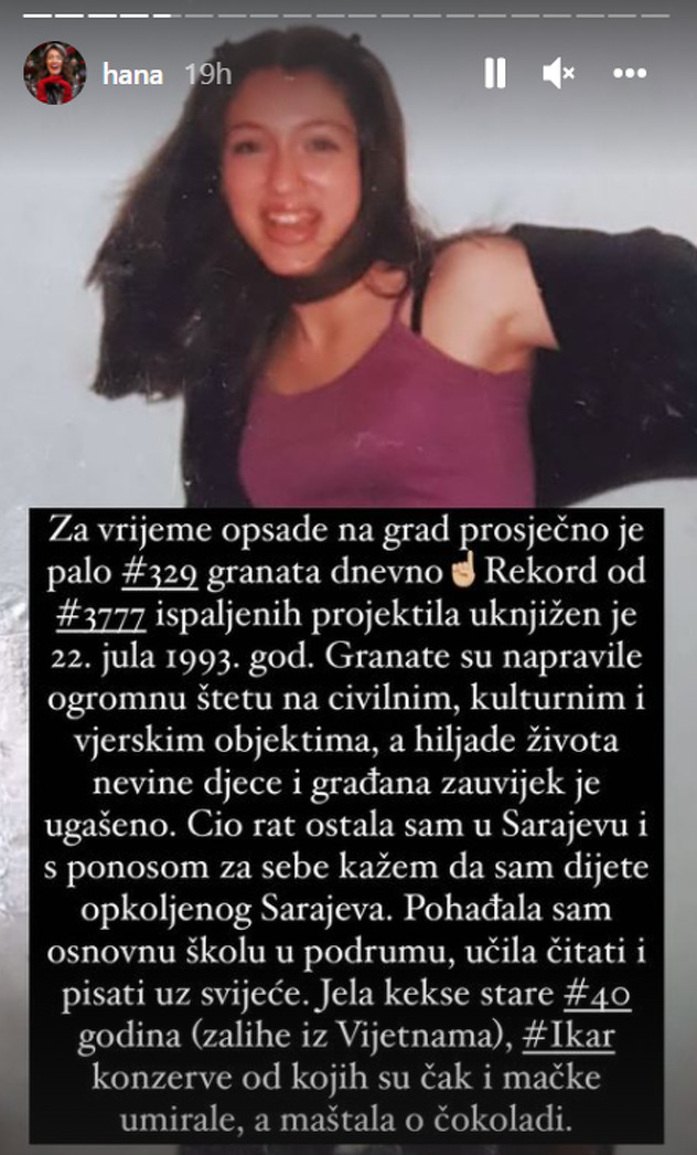 Naime, Hana je na nekoliko Instagram storyja podijelila kratku biografiju kako bi upoznala svoje pratitelje, kojih ima vipe od pola miliona, o svom odrastanju i životu kakav je bio za vrijeme rata u BiH.