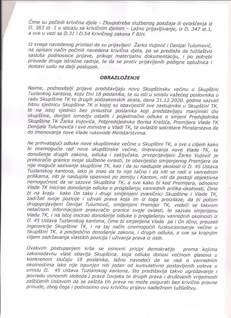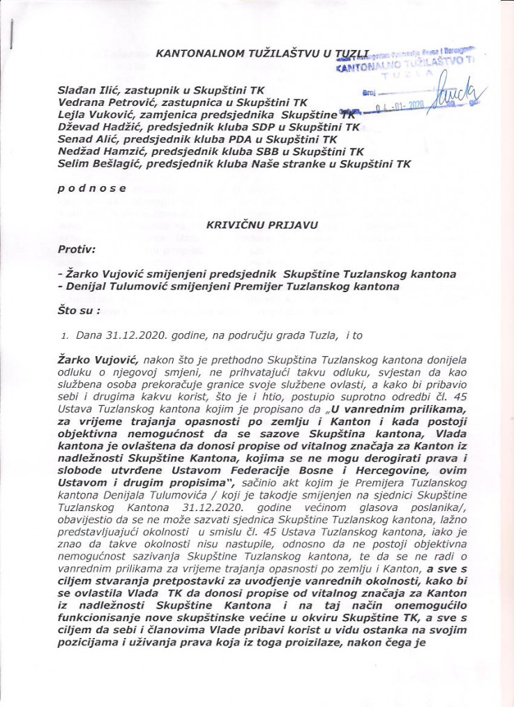 Krivična prijava predata je Kantonalnom tužulaštvu u Tuzli, a potpisuju je Slađan Ilić, zastupnik u Skupštini TK, Vedrana Petrović, zastupnica u Skupštini TK, Lejla Vuković, zamjenica predsjednika Skupštine TK, Dževad Hadžić, predsjednik kluba SDP-a u Skupštini TK, Senad Alić, predsjednik kluba PDA u Skupštini TK, Nedžad Hamzić, predsjednik kluba SBB-a u Skupštini TK te Selim Bešlagić, predsjednik kluba Naše stranke u Skupštini TK.