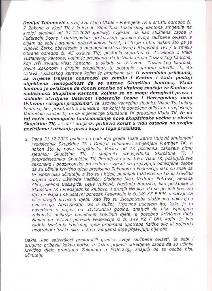 Predate su krivične prijave protiv smijenjenih premijera Tuzlanskog kantona Denijala Tulumovića i predsjednika Skupštine Žarka Vujovića , piše “Avaz”.