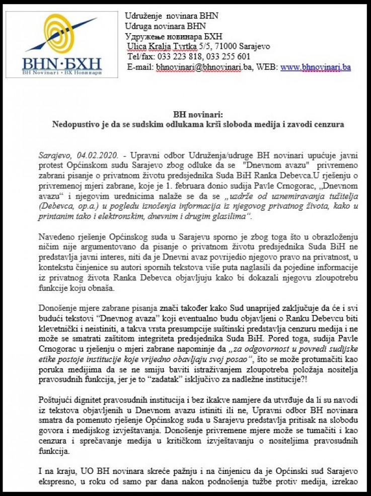 – Upravni odbor Udruženja BH novinari upućuje javni protest Općinskom sudu Sarajevo zbog odluke da se “Dnevnom avazu” privremeno zabrani pisanje o privatnom životu predsjednika Suda BiH Ranka Debevca.U rješenju o privremenoj mjeri zabrane, koje je 1. februara donio sudija Pavle Crnogorac, „Dnevnom avazu“ i njegovim urednicima nalaže se da se „uzdrže od uznemiravanja tužitelja (Debevca, op.a.) u pogledu iznošenja informacija iz njegovog privatnog života, kako u printanim tako i elektronskim, dnevnim i drugim glasilima“.