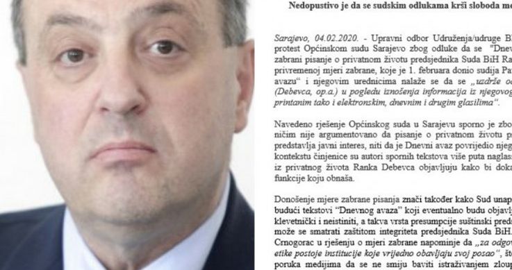 Nakon što je sudija Općinskog suda u Sarajevu Pavle Crnogorac donio privremenu mjeru zabrane “Dnevnom avazu” da piše o privatnom životu predsjednika Suda BiH Ranka Debevca, oglasio se Upravni odbor Udruženja BH Novinari.