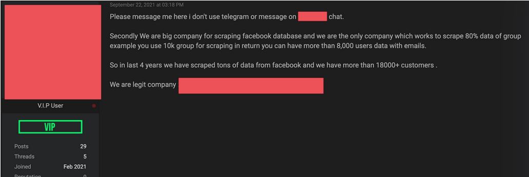Krajem septembra korisnik poznatog hakerskog foruma objavio je kako posjeduje lične podatke više od 1,5 milijardi korisnika Facebooka. Podaci su trenutno u prodaji na odgovarajućoj platformi foruma, a potencijalni kupci imaju priliku “nabaviti” podatke odjednom ili u manjim količinama.