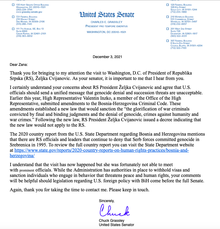 – Hvala što ste mi skrenuli pažnju na posjetu predsjedice RS Željke Cvijanović Vašingtonu. Razumijem Vašu zabrinutost zbog toga i saglasan sam da bi američki zvaničnici trebali poslati zajedničku poruku da su negiranje genocida i prijetnje napretku neprihvatljive – napisao je u odgovoru senator Grassley.