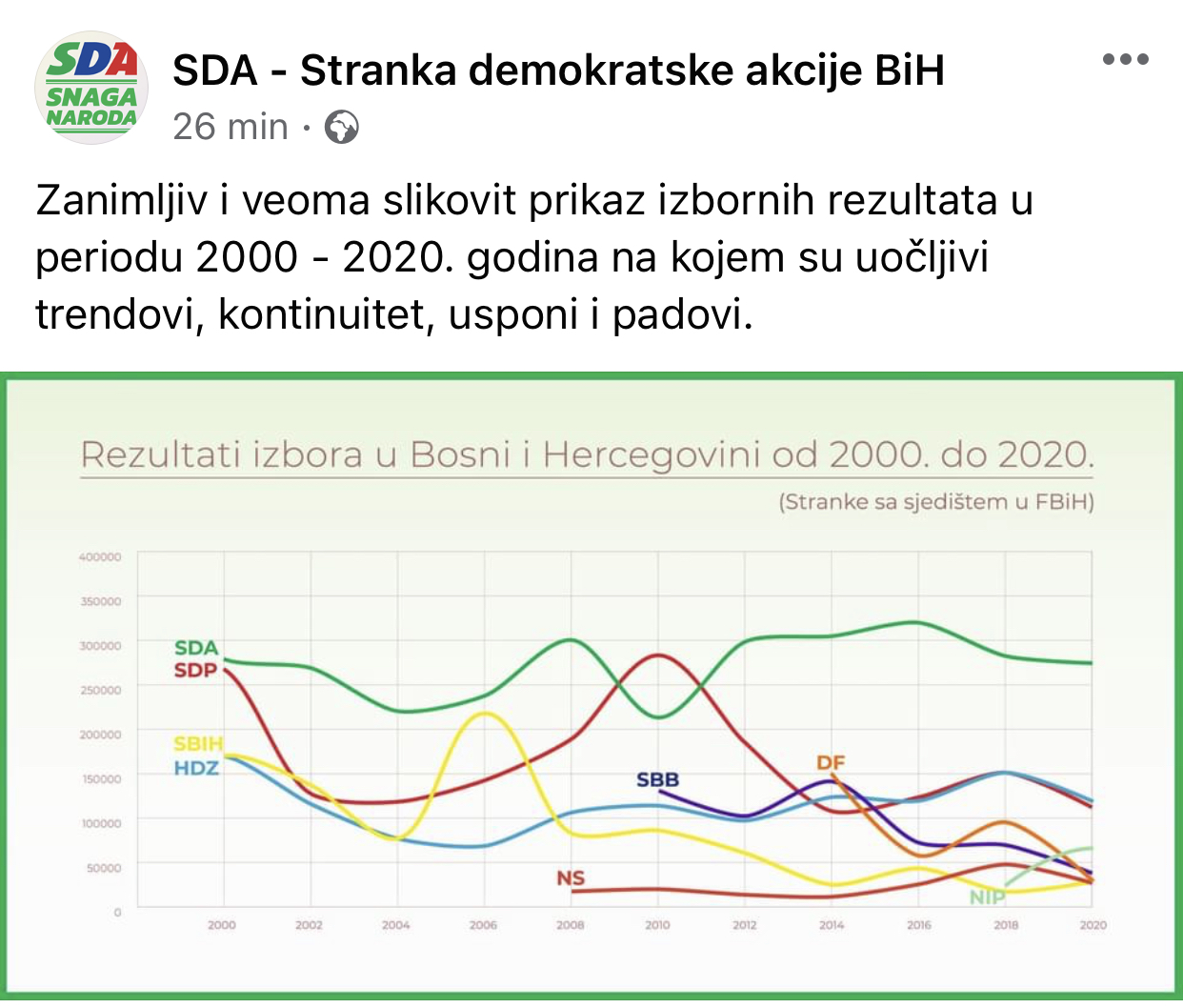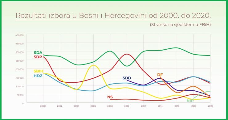 “Zanimljiv i veoma slikovit prikaz izbornih rezultata u periodu 2000 – 2020. godina na kojem su uočljivi trendovi, kontinuitet, usponi i padovi”, piše u opisu objave SDA.