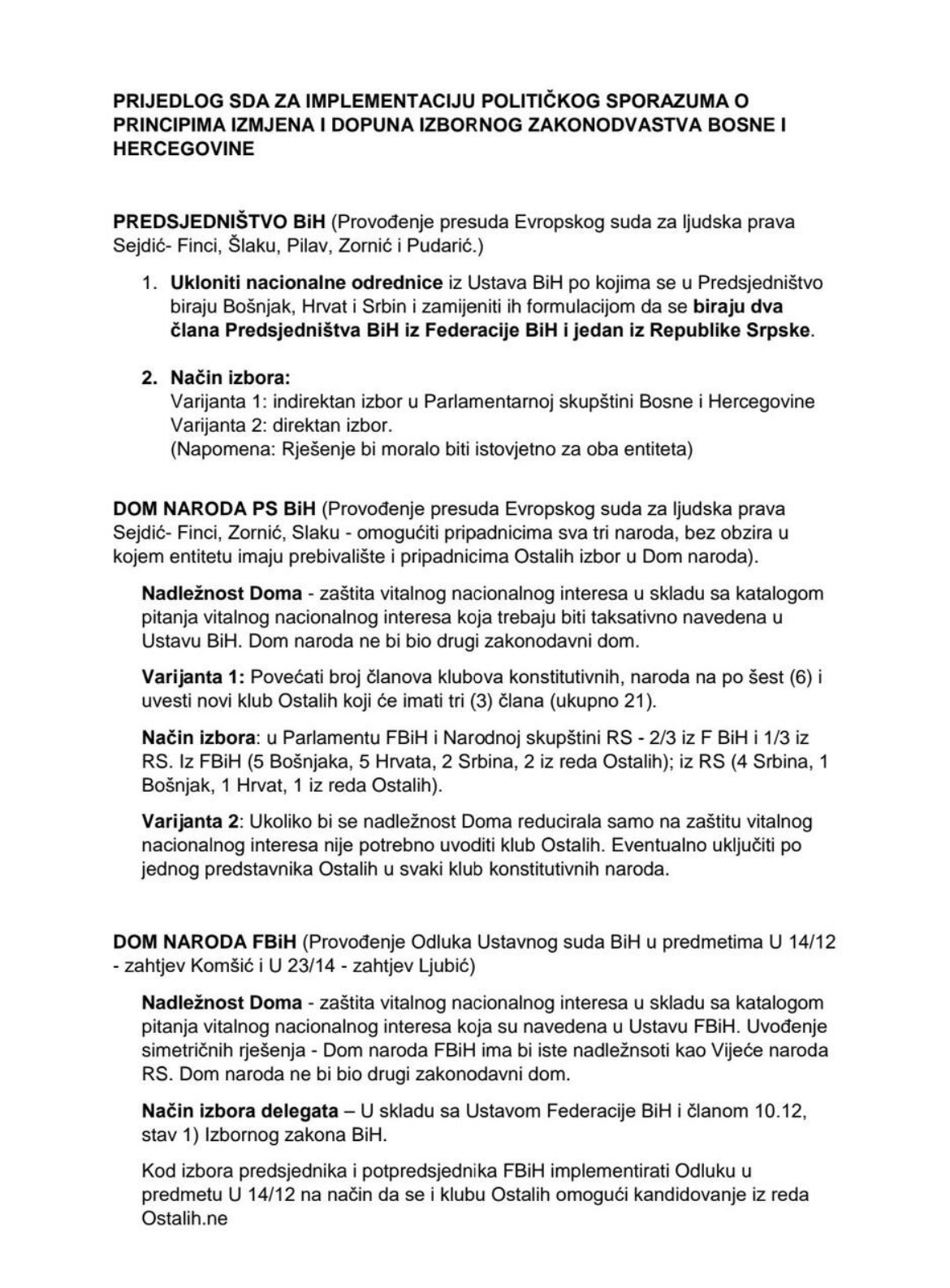 “SDA je javnosti obznanila svoj prijedlog, kojim se presude Evropskog suda za ljudska prava provode na temelju principa i rješenja sadržanih u takozvanom Aprilskom paketu ustavnih promjena, a presude Ustavnog suda BiH uklanjanjem postojeće asimetrije u funkcioniranju Vijeća naroda RS-a i Doma naroda FBiH, odnosno striktnog svođenja ovlasti Doma naroda FBiH na zaštitu vitalnih nacionalnih interesa. Tvrdnje pojedinih predstavnika stranaka da prijedlog SDA „vodi u podjelu zemlje“ ne samo da su pogrešne, već ukazuju na zabrinjavajuću činjenicu da neki od aktera aktuelnih razgovora nisu ni pročitali prijedlog SDA”, napisao je Izetbegović.