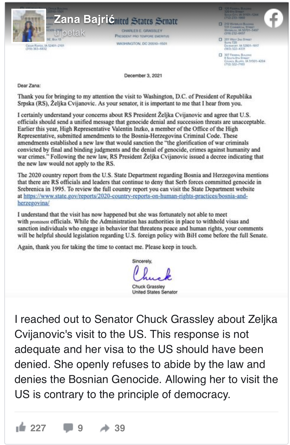 Američka advokatica bosanskohercegovačkog porijekla Zana Bajrić je u pismu republikanskom senatoru Chucku Grassleyju negodovala zbog posljednje posjete predsjednice RS-a Željke Cvijanović (SNSD) SAD-u, a potom se oglasio i sam senator Grassley.