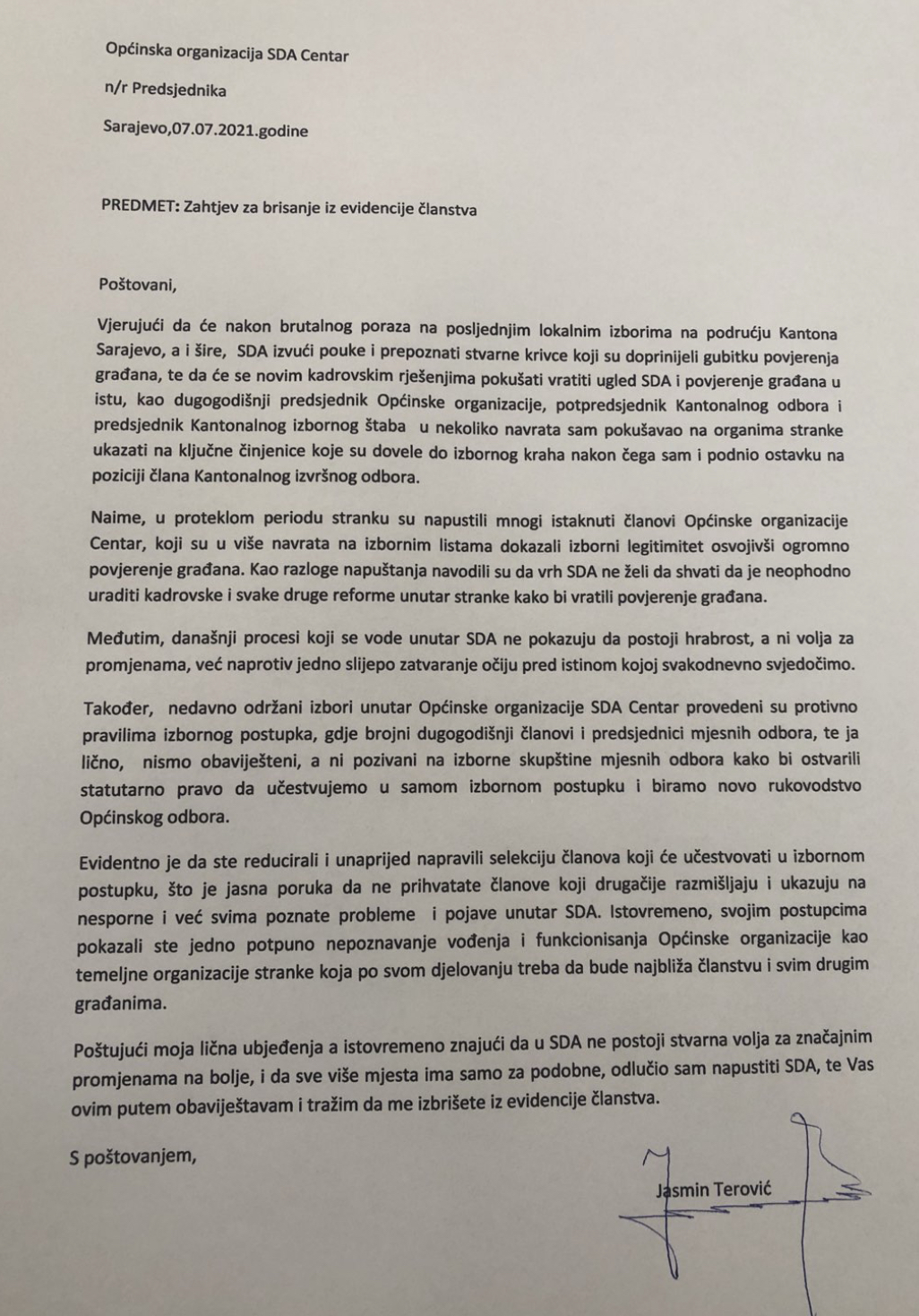 “Poštujući lična ubjeđenja, a istovremeno znajući da u SDA ne postoji stvarna volja za značajnim promjenama na bolje, i da sve više mjesta ima samo za podobne, odlučio sam napustiti SDA, te vas ovim putem obavještavam i tražim da me izbrišete iz evidencije članstva”, stoji u zaključku pisma Jasmina Terovića.