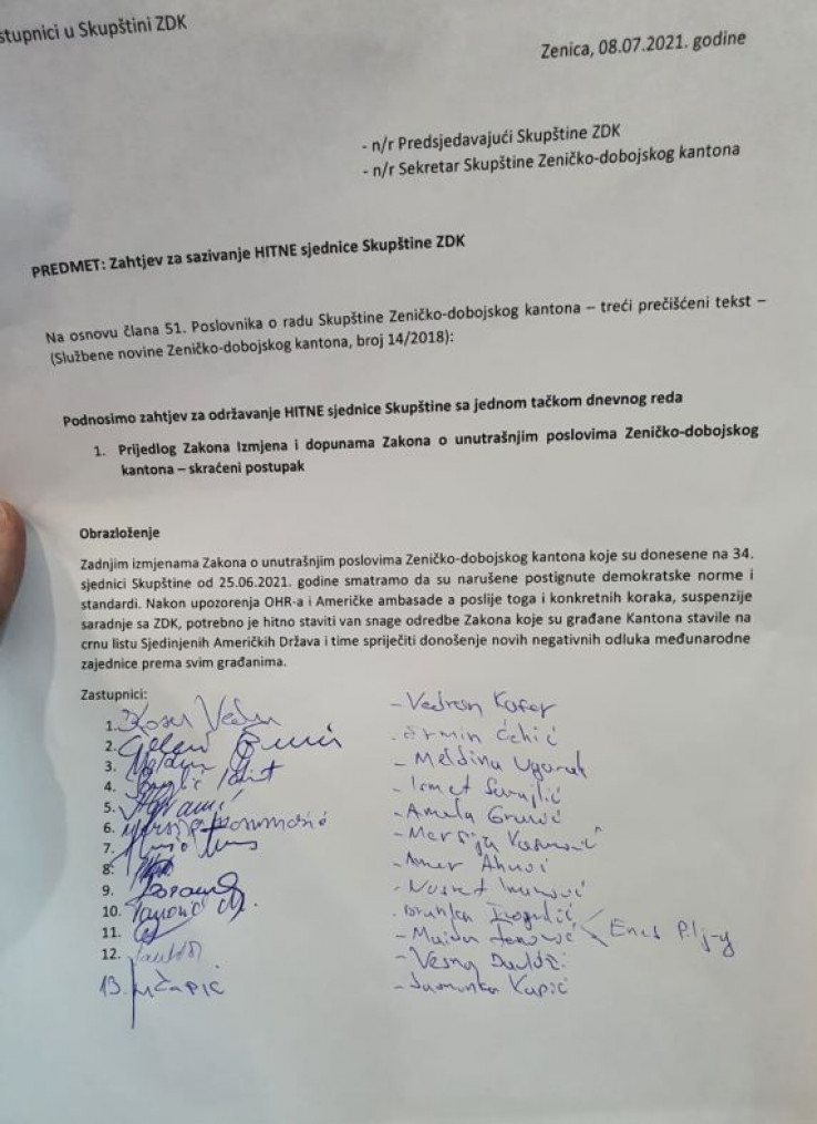 Zastupnici opozicije u Zeničko-dobojskom kantonu, njih 13, stavilo je potpis na zahtjev za sazivanje hitne sjednice Skupštine ZDK sa jednom tačkom dnevnig reda, prijedlog Zakona o izmjenama i dopunama Zakona o unutrašnjim poslovima ZDK.