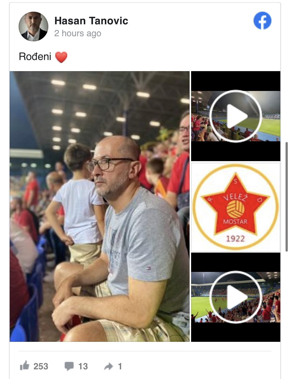 Podršku “Rođenim” na Grbavici je večeras pružio i načelnik Općine Novo Sarajevo Hasan Tanović koji je na društvenim mrežama objavio fotografije s utakmice uz kratku poruku podrške mostarskom klubu.