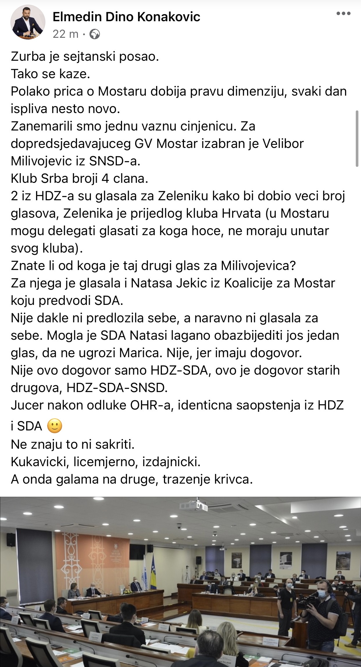 Elmedin Konaković, lider naroda i pravde oglasio se jutros rano na svom Facebook profilu i pojasnio kako je to Mostar dogovor ne samo SDA i HDZ-a već i SNSD-a.