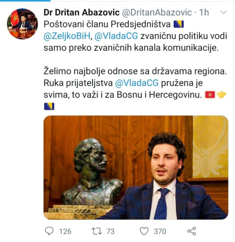 – Poštovani članu Predsjedništva Željko Komšiću, Vlada Crne Gore zvaničnu politiku vodi samo preko zvaničnih kanala komunikacije. Želimo najbolje odnose sa državama regiona. Ruka prijateljstva Vlade Crne Gore pružena je svima, to važi i za Bosnu i Hercegovinu – napisao je Abazović