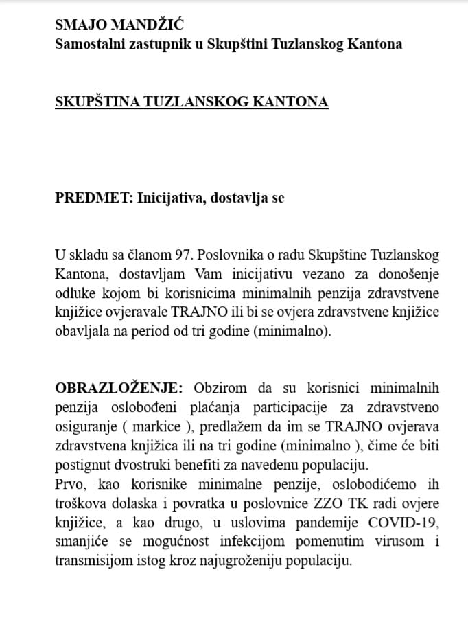 Samostalni zastupnik u Skupštini Tuzlanskog kantona Smajo Mandžić uputio je inicijativu kojom traži da se donese odluka kojom bi se korisnicima minimalnih penzija zdravstvene knjižice ovjeravale trajno ili na minimalni period od tri godine.