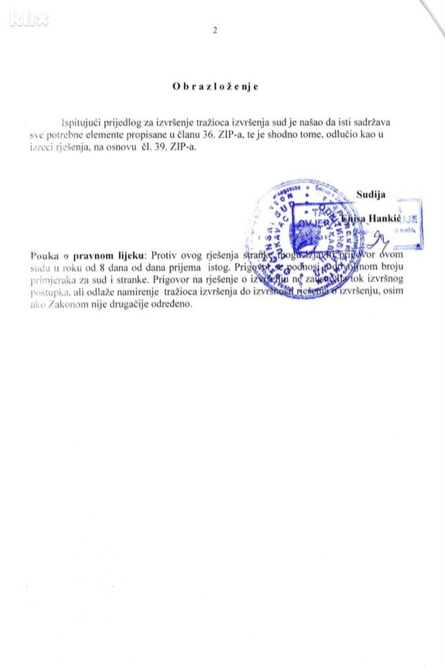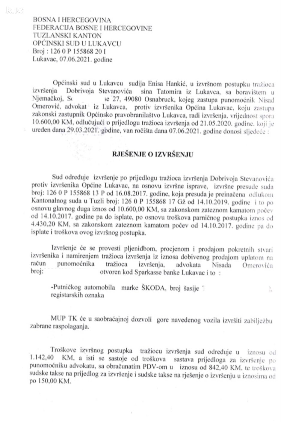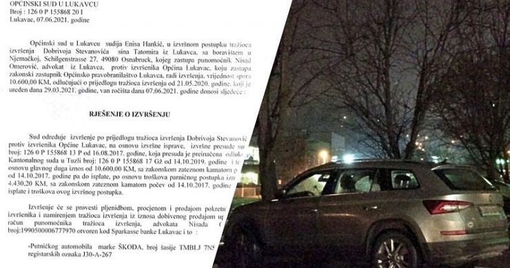 Općinski sud u Lukavcu donio je rješenje o izvršenju presude, na osnovu kojeg bi trebala biti zaplijenjena imovina Općine Lukavac, a u konkretnom slučaju riječ je o službenom automobilu marke Škoda Kodiaq, tamošnjeg načelnika Edina Delića.
