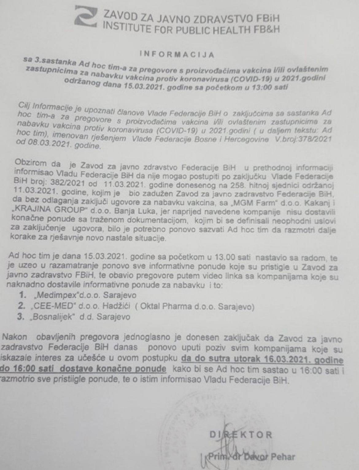 Fadil Novalić, premijer Federacije je svim kompanijama potpisao pismo namjere za nabavku vakcina a nakon obavljenih pregovora jednoglasno je donesen zaključak da Zavod za javno zdravstvo FBiH danas ponovo uputi poziv svim kompanijama koje su iskazale interes za učešće u ovom postupku, da sutra do 16 sati dostave konačne ponude.